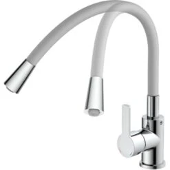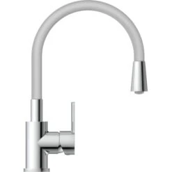 Flexo Spültischarmatur mit Soft-Touch Schlauch Chrom-Hellgrau. Diese elegante Küchenarmatur ist eine gelungene Kombination aus Funktion und Design Der farbige Rundbogenauslauf in Soft-Touch Qualität ist nicht nur eine Hingucker für die Spüle, sondern auch noch in alle Richtungen biegsam für einen großen Aktionsradius.