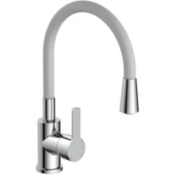 Flexo Spültischarmatur mit Soft-Touch Schlauch Chrom-Hellgrau. Diese elegante Küchenarmatur ist eine gelungene Kombination aus Funktion und Design Der farbige Rundbogenauslauf in Soft-Touch Qualität ist nicht nur eine Hingucker für die Spüle, sondern auch noch in alle Richtungen biegsam für einen großen Aktionsradius.