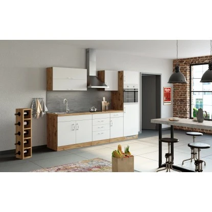 Die Küchenzeile wird Ihnen zerlegt und ohne Dekoration geliefert. Die Anordnung der Küchenelemente und die Anschläge der Türen sind somit für Sie frei wählbar. Die Arbeitsplatte wird ohne Ausschnitte geliefert. Technische Änderungen und Irrtümer vorbehalten