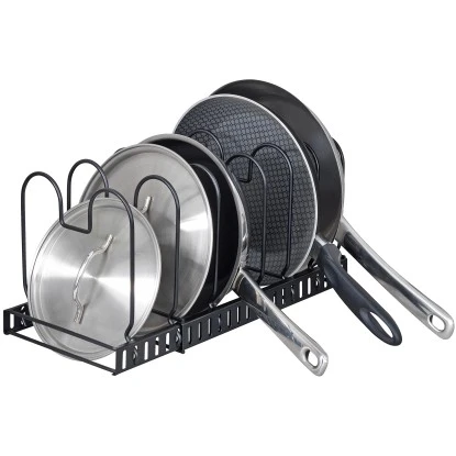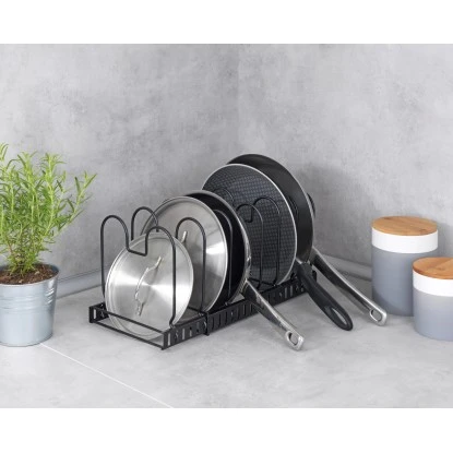 Ordnung macht Laune! Der moderne Geschirrständer ermöglicht eine platzsparende und übersichtliche Aufbewahrung von Pfannen, Deckeln, Backformen, Geschirr, Auflaufformen, Schneidebrettern, etc. in unterschiedlichen Größen.
